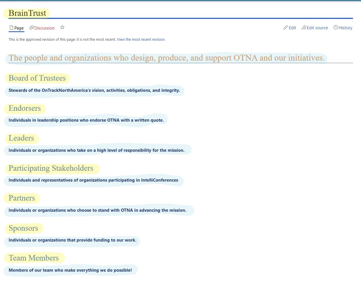 Screenshot of BrainTrust on the wiki with key information highlighted