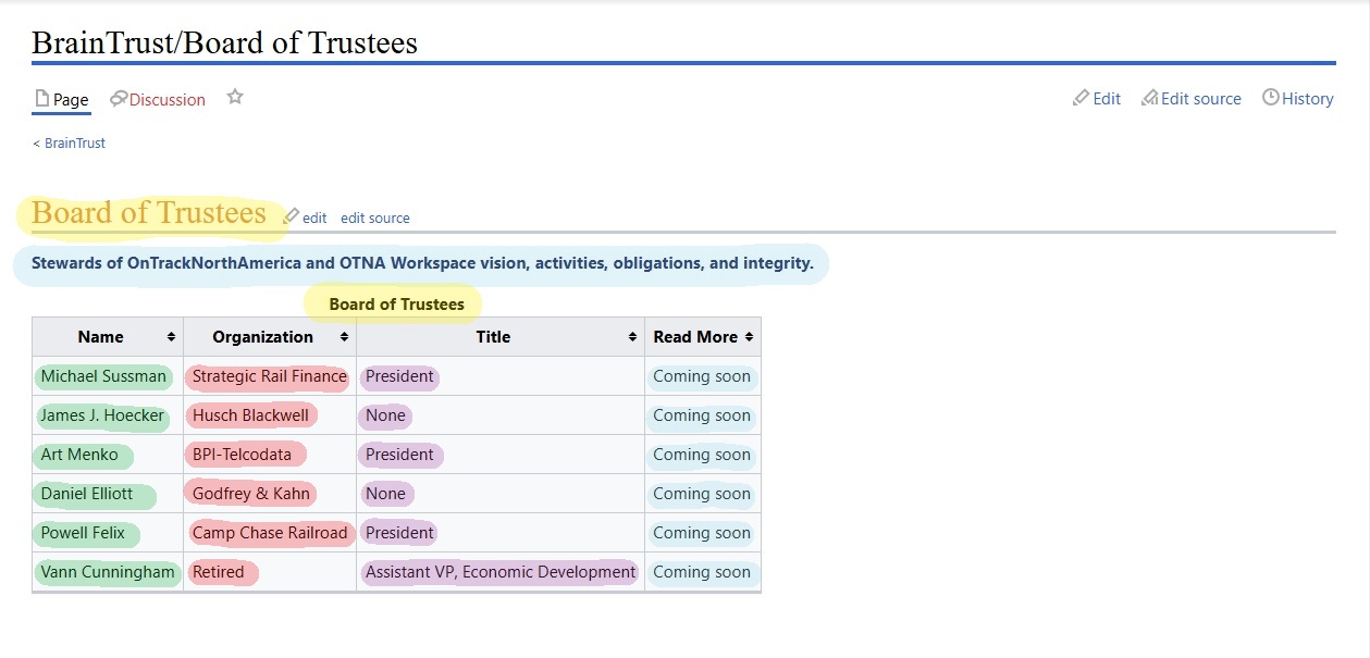 Screenshot of Board of Trustees page on wiki with key information highlighted