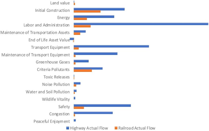 The Land Freight Lifecycle Impact Calculatorincludes data from prior research conducted in the United States. When impact factors have not been researched in the U.S., overseas research was used. These gaps need to be addressed with future primary research. The data shows that the total lifecycle cost of a highway project is approximately five times the lifecycle cost of a railroad project.